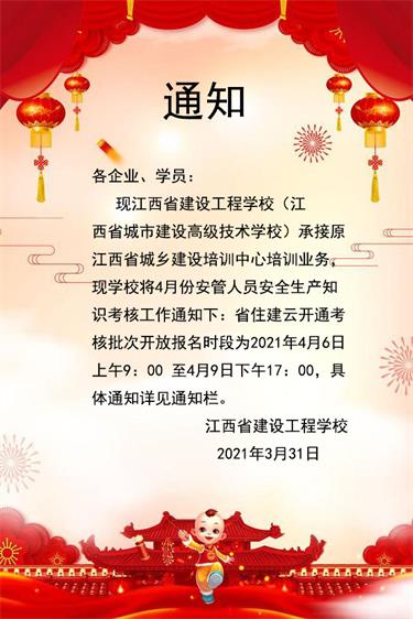 為繼續提升安管人員考核工作實效,深入推行“一次性告知”制度,江西省城鄉建設培訓中心(以下簡稱中心)結合當前工作實際,不斷優化組織考核流程以服務企業、學員。現將中心1月份安管人員安全生產知識考核工作通知如下: