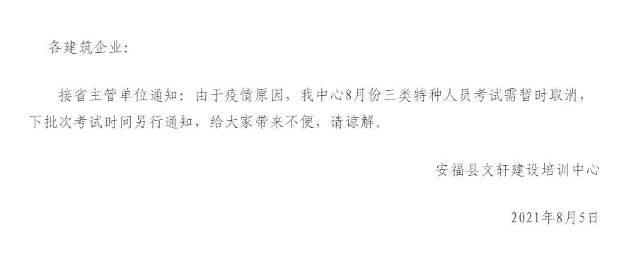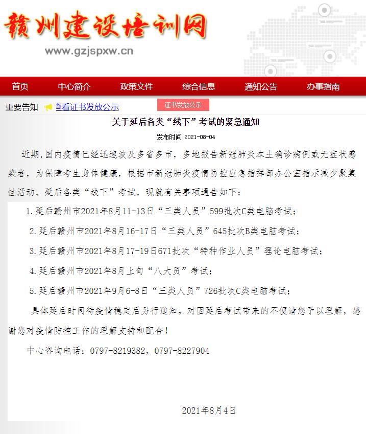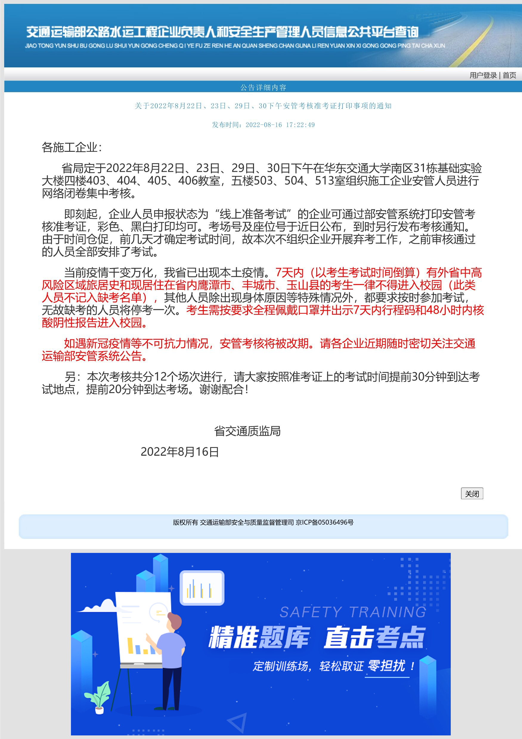 經與華東交通大學屬地疫情防控部門聯系,鑒于當前新冠肺炎疫情形勢,為有效防范聚集性疫情發生,保障廣大考生和考試工作人員身體健康和生命安全,經研究,決定推遲原定于2022年8月29日下午、8月30日下午組織開展的“公路水運工程施工企業主要負責人和安全生產管理人員集中考核(網絡)”。集中考核重啟時間和打印準考證時間將根據疫情防控情況另行通知。