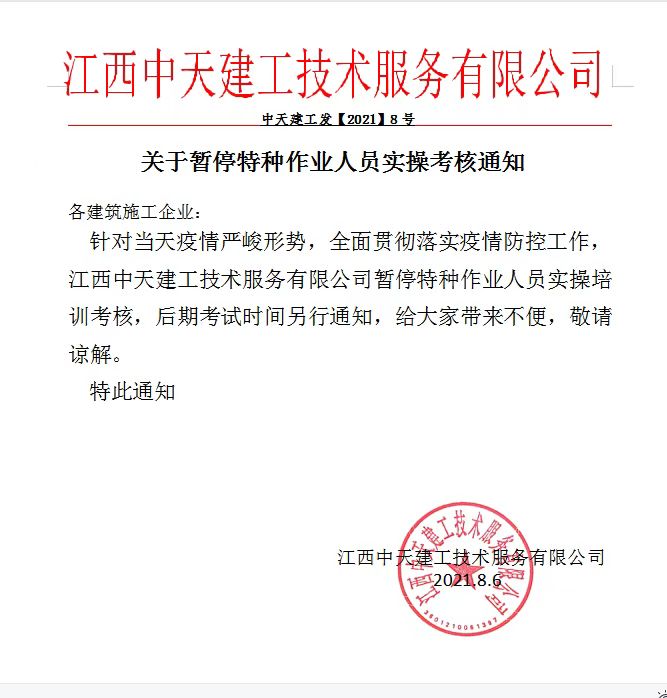 3、各企業和考生須嚴格落實《江西省新型冠狀病毒感染的肺炎疫情防控應急指揮部令(第21號)》(詳見附件2)和《南昌市新冠肺炎疫情風險提示(第113號)》(詳見附件3)的防控有關要求,自覺做好防護。不符合疫情防控要求的考生將禁止入場考試,由此造成的缺考等相關后果由考生及企業自行承擔。對防控不力的企業,將上報省建設工程安全質量監督管理局按相關程序處理。為有效減少人員流動和聚集,阻斷疫情傳播,更好保障廣大學員的身體健康和生命安全,建議:國內中高風險、重點地區及其他外省考生不參加此次考核,經登記后不算無故缺考,疫情防控情況穩定后,我們將盡快安排上述人員考核。