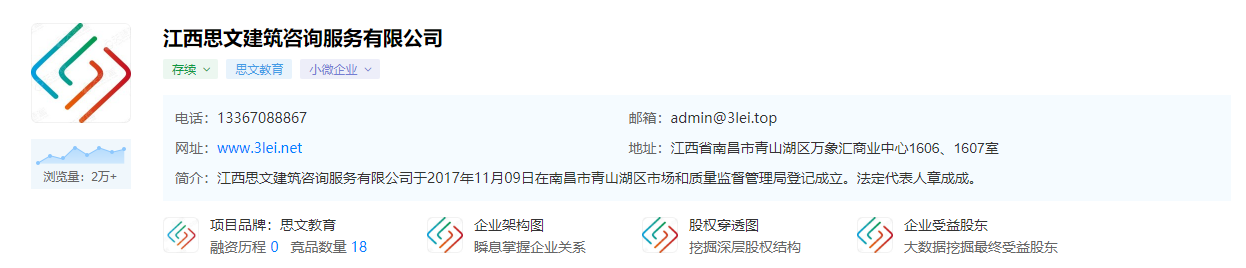 江西思文建筑咨詢服務有限公司于2017年11月09日在南昌市青山湖區市場和質量監督管理局登記成立。